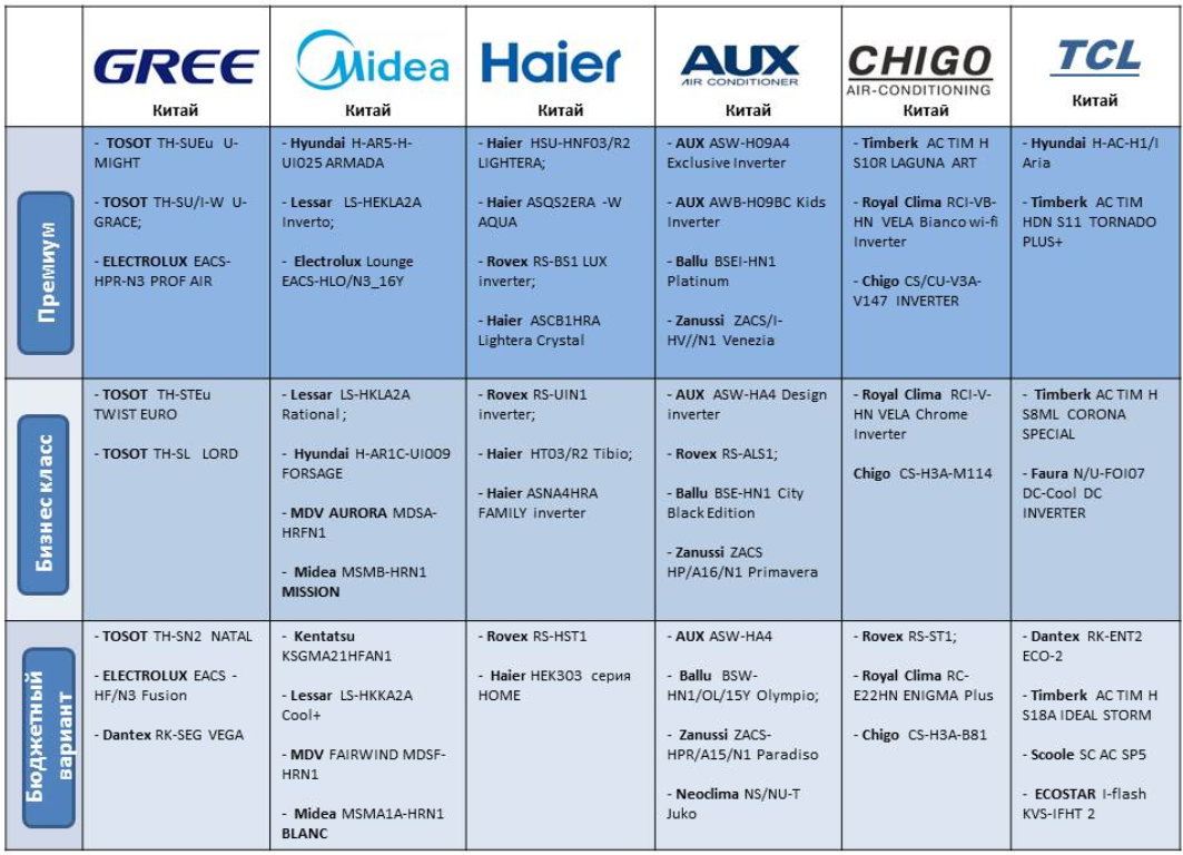 Сейчас самые популярные на рынке РФ бренды кондиционеров это Haier, Midea, Ballu, Mitsubishi, Electrolux, Daikin, TCL, Gree, AUX и Hisense.